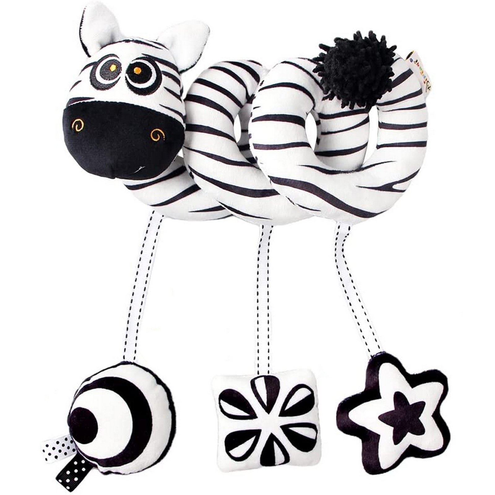 Źródło: Strefa ZabawekKontrastowa spirala to klasyczny element wyprawki, który idealnie pasuje do pałąka wózka lub szczebelków łóżeczka. Dzięki swojej czarno-białej kolorystyce jest doskonale widoczna dla noworodków, które w pierwszym etapie życia nie odróżniają jeszcze pastelowych barw.