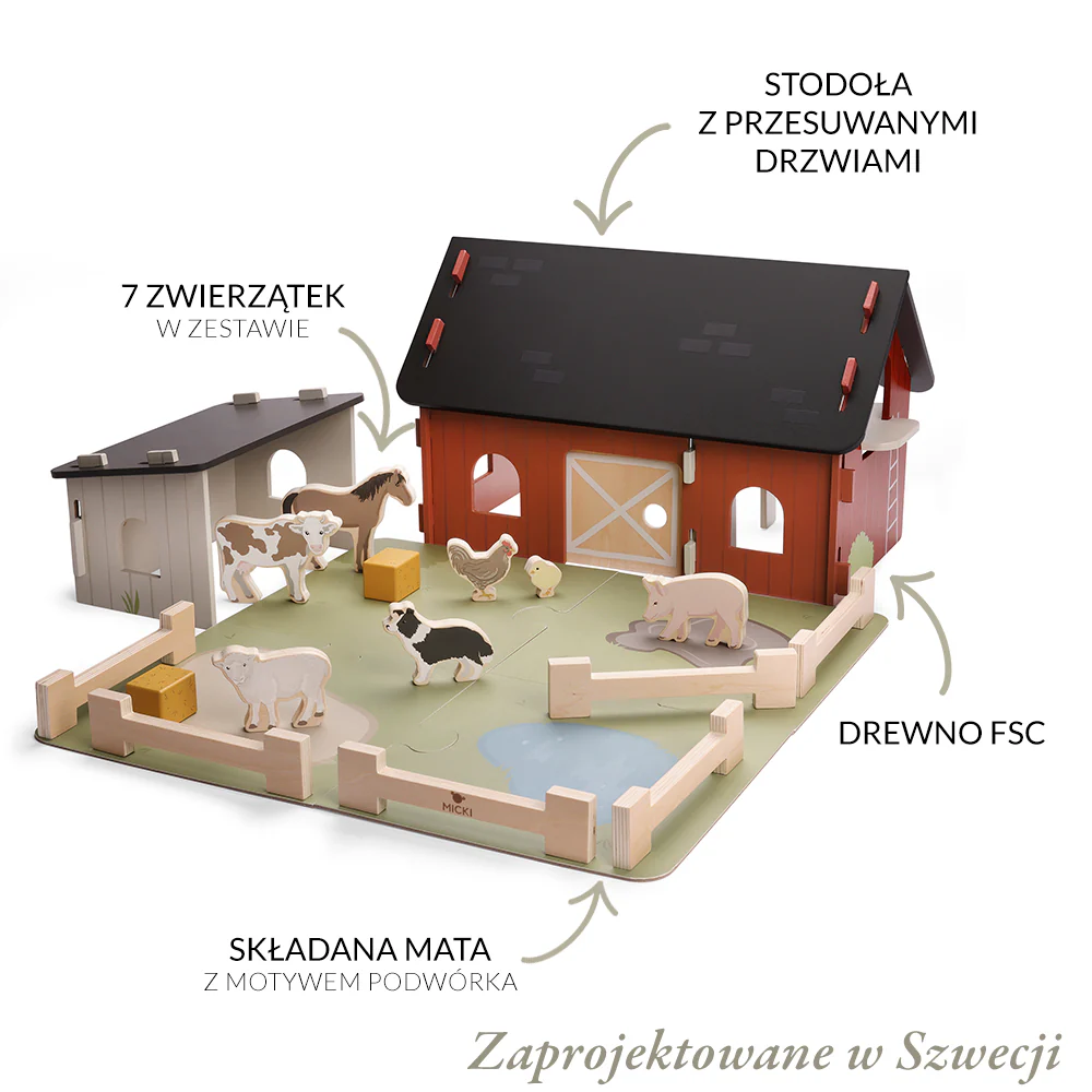 Tradycyjna drewniana makieta gospodarstwa to klasyka, która nigdy się nie nudzi. Farma od marki Micki pozwala dziecku wejść w rolę opiekuna zwierząt, co jest doskonałym wstępem do nauki empatii i odpowiedzialności. Prosty, skandynawski design sprawia, że zabawka nie przebodźcowuje malucha i zostawia miejsce na własną inwencję.